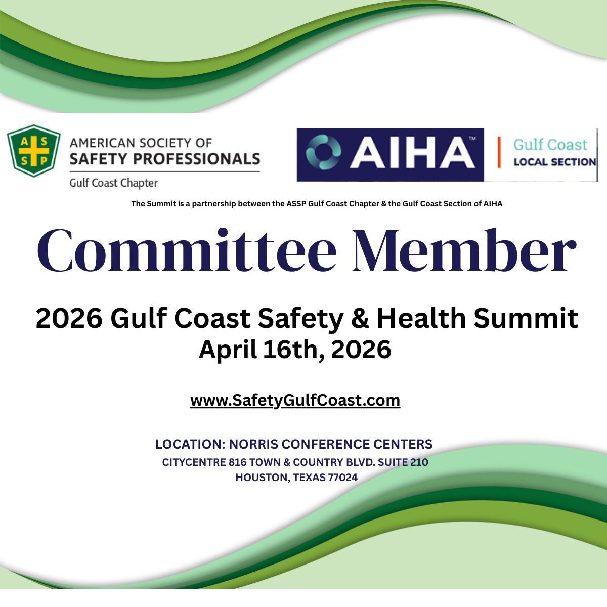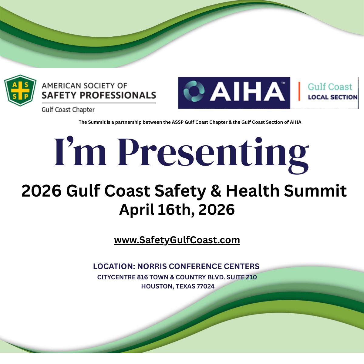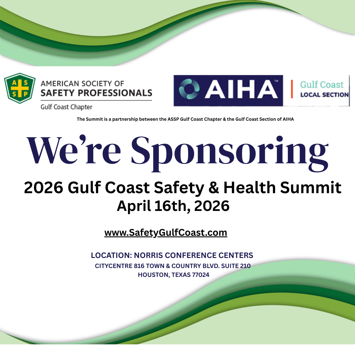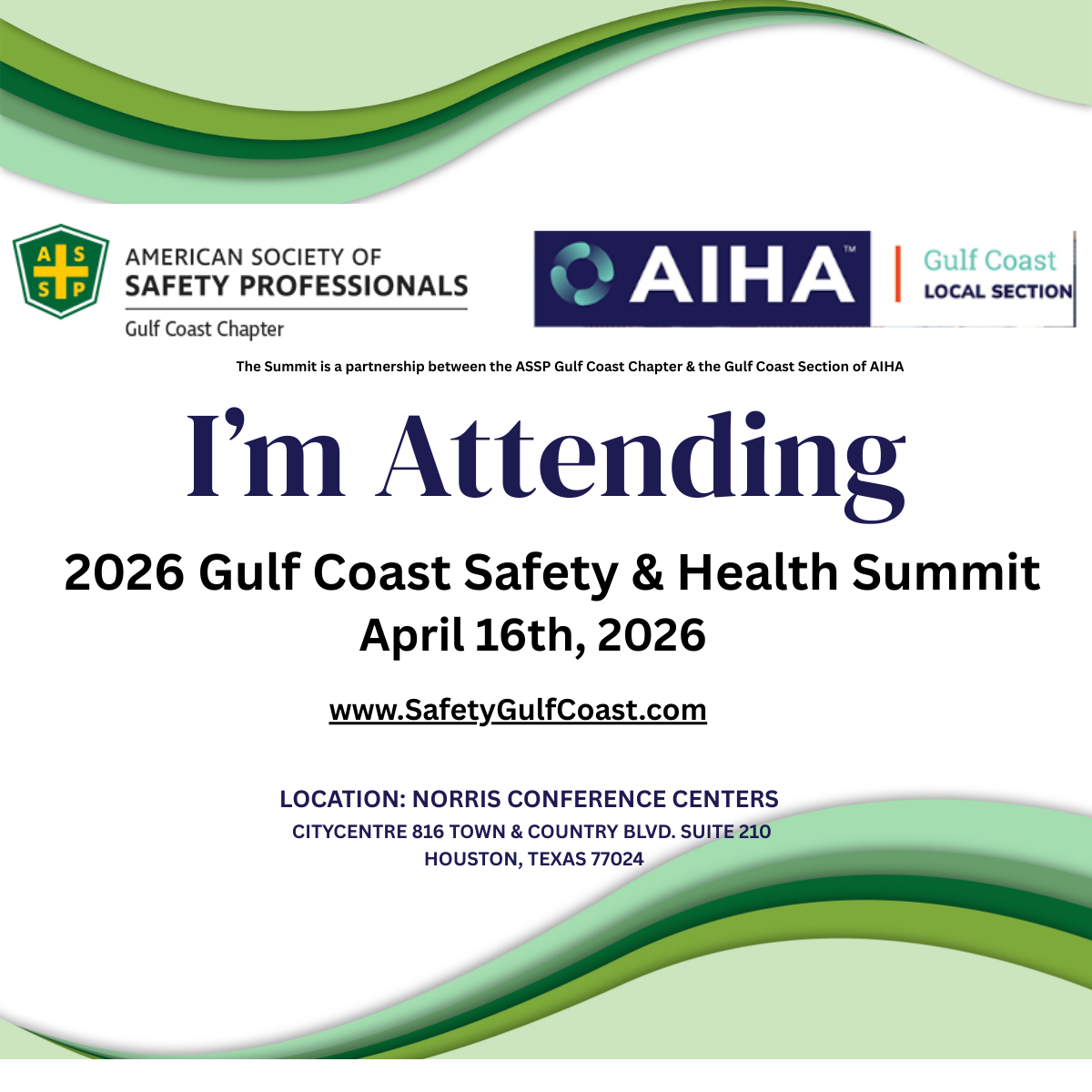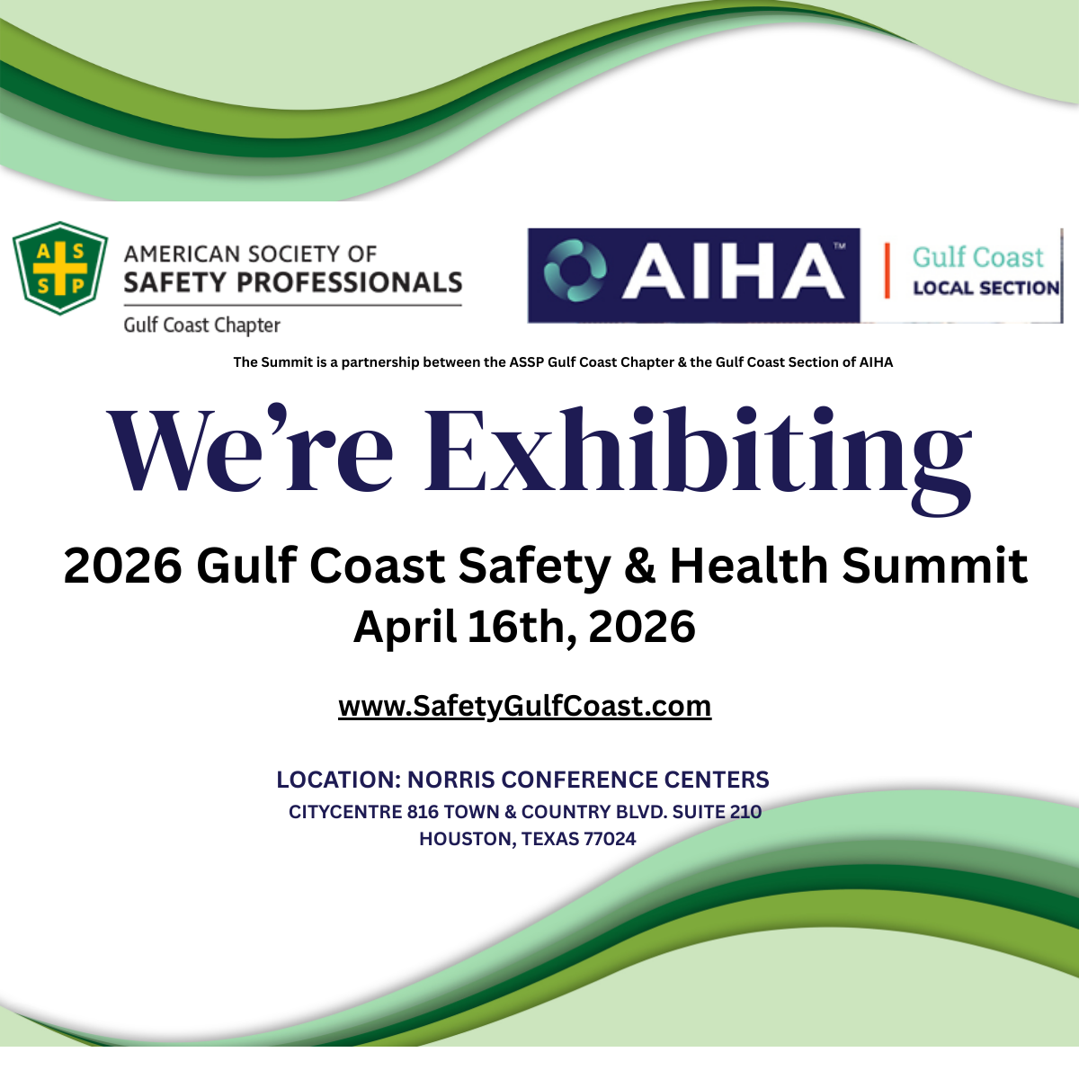 Please help the 2026 Gulf Coast Safety & Health Summit promote the event on social media by using the images below. When posting online it is great to include the image below and please include a link to www.SafetyGulfCoast.com your post for event details. You can right click and save the images in the gallery or use the download links below.
